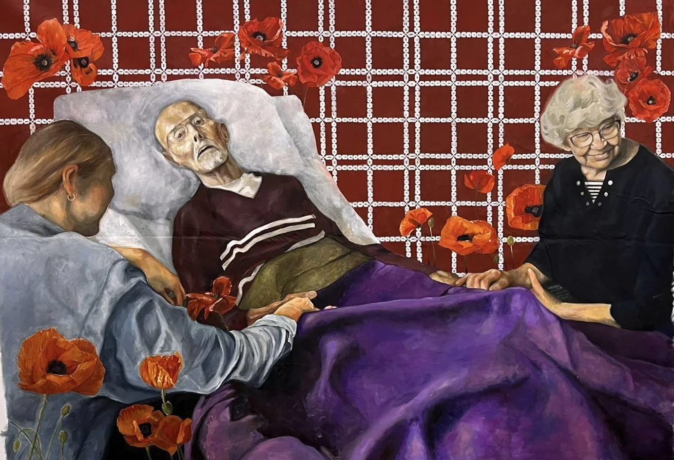 My grandfather is the only figure in the painting that is looking at the viewer, an intentional choice to emphasize his solitude in his final days, a feeling that lingers with me as guilt. Poppies, scattered throughout the piece, symbolize him; some bloom, while others decay, mirroring how memories fade but never fully disappear.