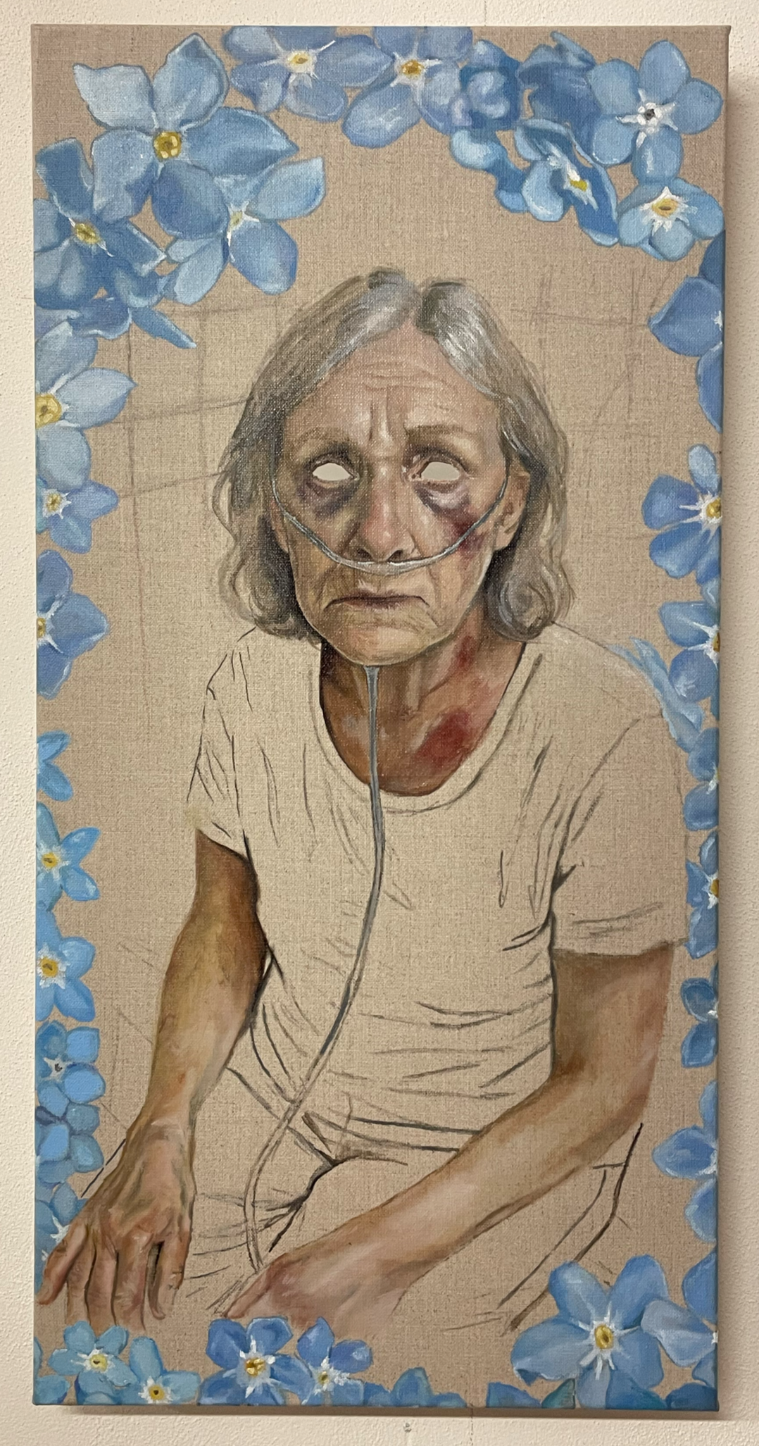 Her work for this exhibition was based on a personal experience in a Dutch nursing home, reflecting on the fragility of aging, the emotional labor of care work, and the irreplaceable importance of human connection in healthcare. Using AI-generated references as a starting point and translating them into oil on raw linen, Jasmijn Doukje explored the tension between digital efficiency and the tactile, human presence of caregiving.