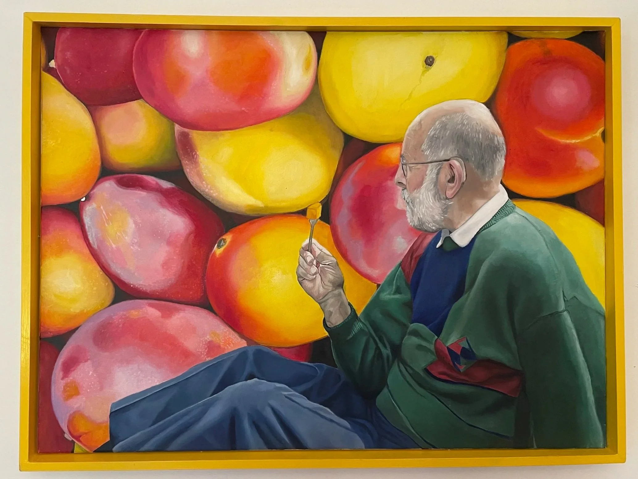 In this work, I depict my grandfather seated in a world completely overtaken by mango, a reality in which there is no escape from this altered perception. The overwhelming presence of the fruit becomes a metaphor for his internal struggle, illustrating how neurological changes can distort everyday life. The work reflects on the loss of sensory joy and how this affects mental health, and one’s connection to the world. Through this work, the symbolism of the mango depicts both the absurdity and tragedy of 'Monotaste'.