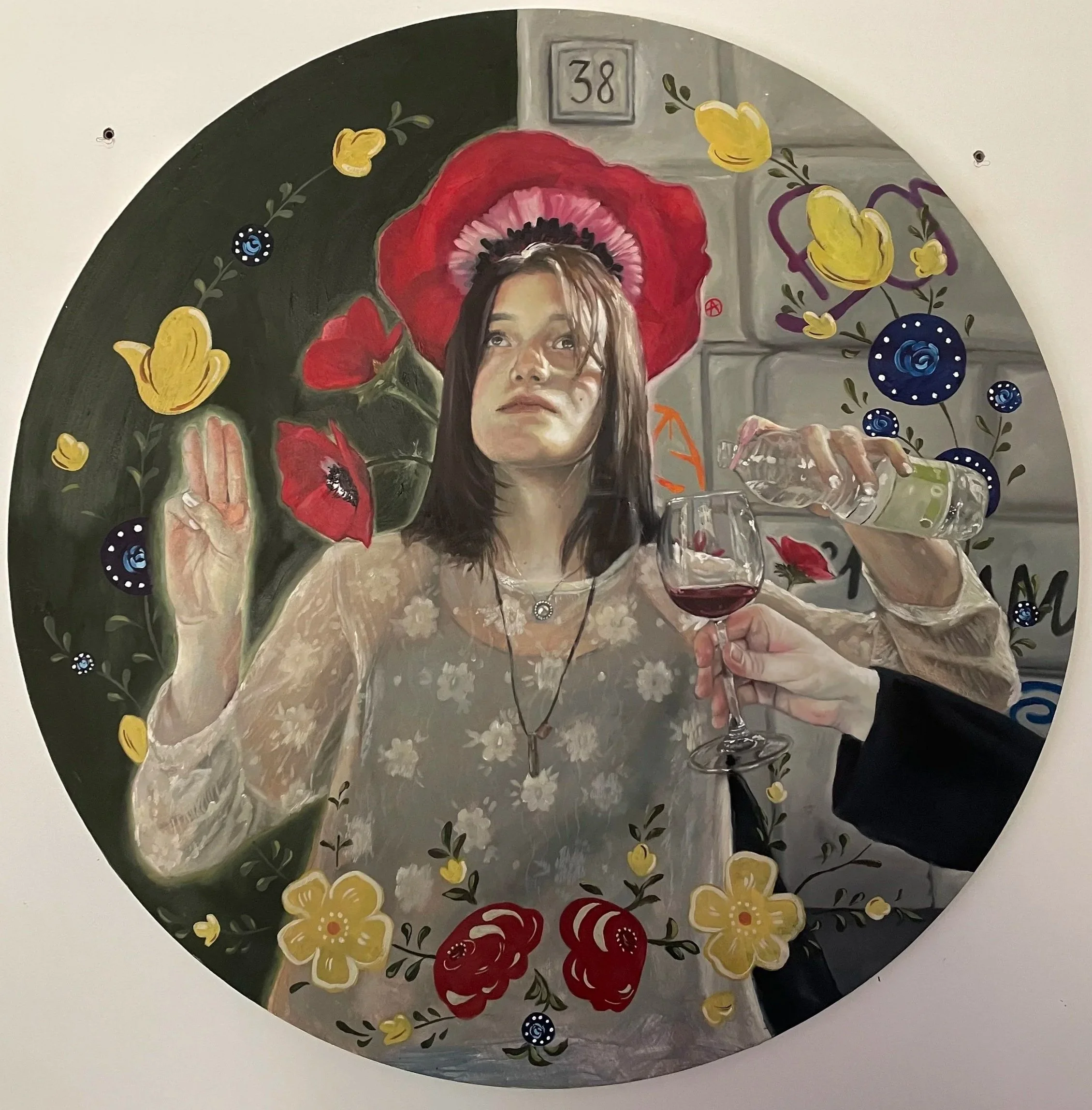 Saints of San Lorenzo brings together religious symbolism and cultural hybridity. Inspired by Hindeloopen decorative painting, the work depicts fellow artist Valentina Diamante through gestures traditionally associated with Christ, reinterpreted. The divided background, combining Dutch (Hindeloopen) folk ornamentation with the Roman street culture of the San Lorenzo neighborhood in Rome, reflects the artist’s lived experience between these two worlds and frames the work as a contemporary act of reverence.