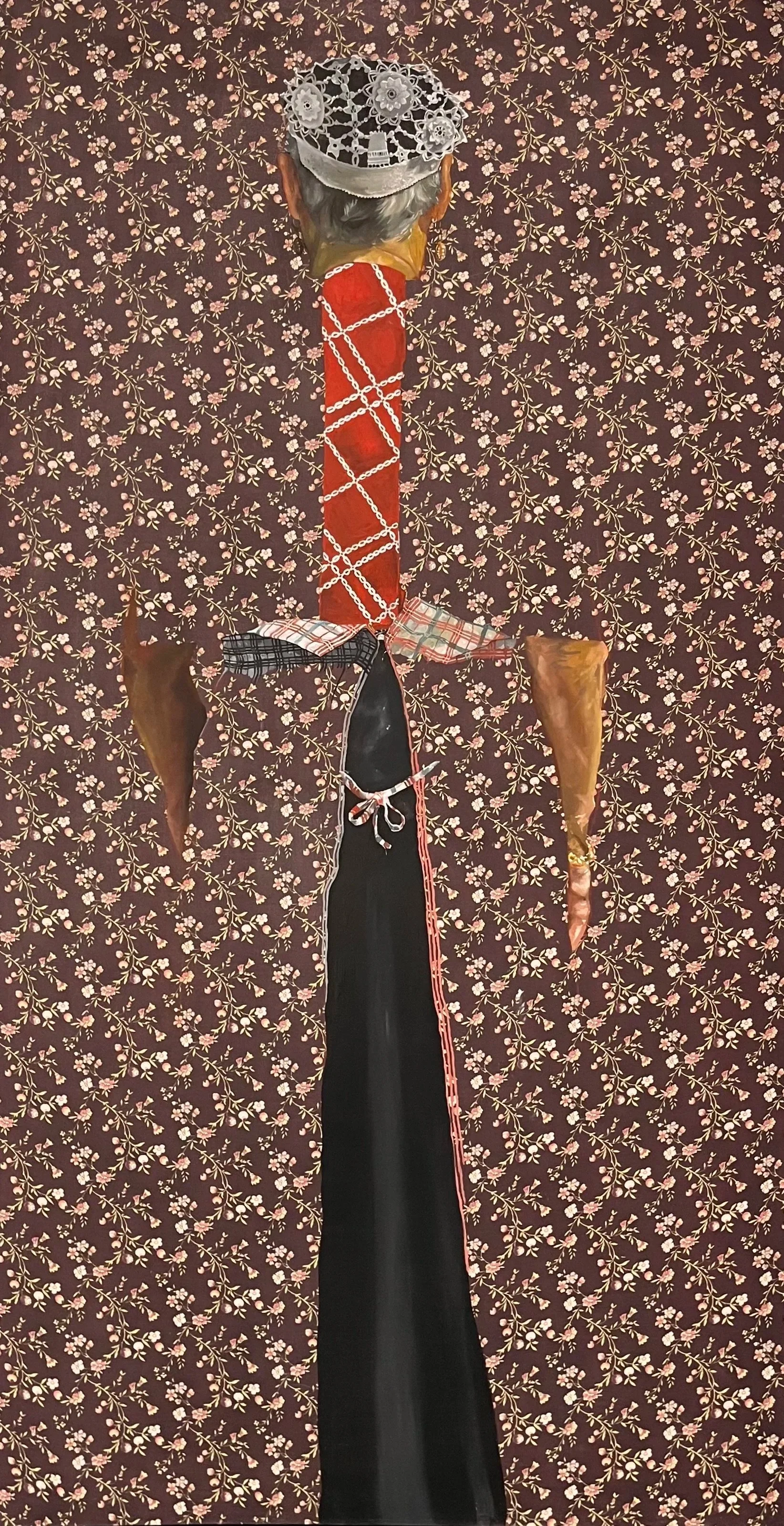 The painting on display called Donker Paars was inspired by the traditional clothing of the town Bunschoten-Spakenburg in the Netherlands and the towns outlook on grief and the use of different fabrics in this process. The work is a part of a tryptic depicting women in different stages of grief called Rouw Kent Geen Tijd.